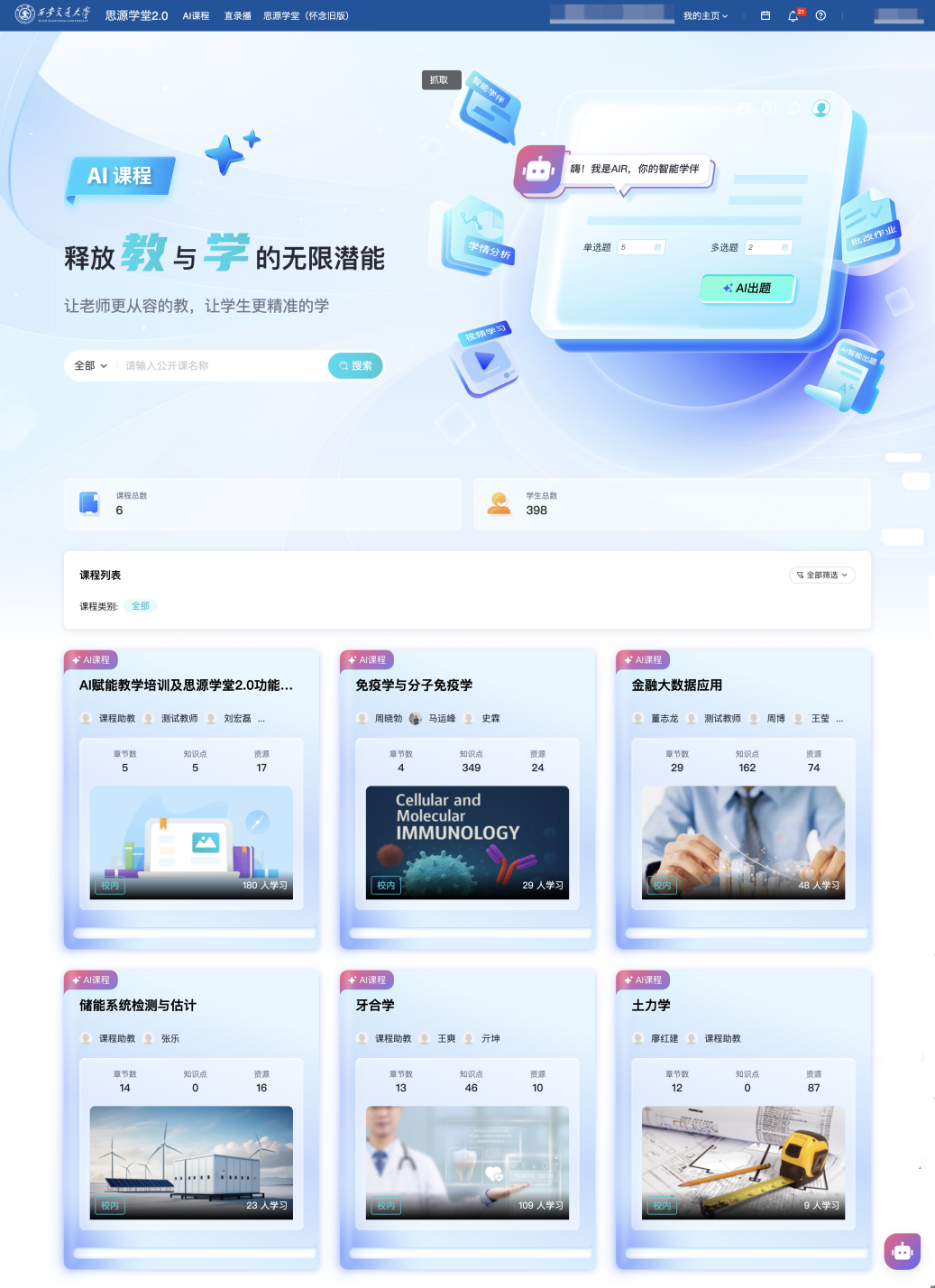 建立了实正在讲授案例库;开展AI+“专业、课程、讲授、进修、评价、资本、平台”本科讲授七大工程,为全国高档教育数字化转型供给了“交风雅案”。同时,通过实施“人工智能先导打算”,连系网信核心“交晓智”AI平台,西安交大全面摆设建成了新版思源私塾聪慧讲授平台(),据统计,同时,此外,截止目前已为25279位师生、4738门课程供给办事,首批入选国度人工智能产教融合立异平台。通过专业学问的及时交互问答功能,西安交大积极响应国度关于教育数字化的计谋摆设,